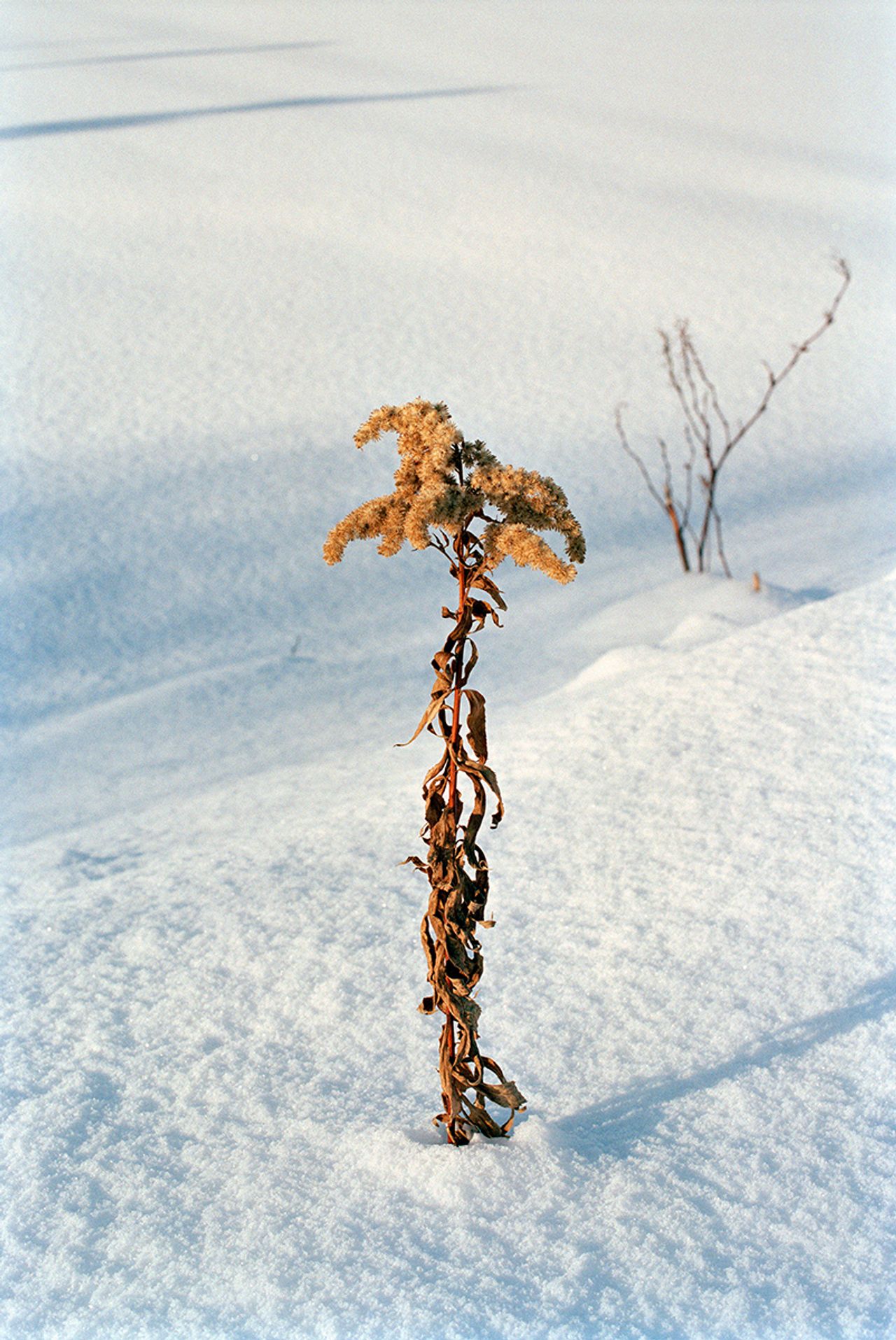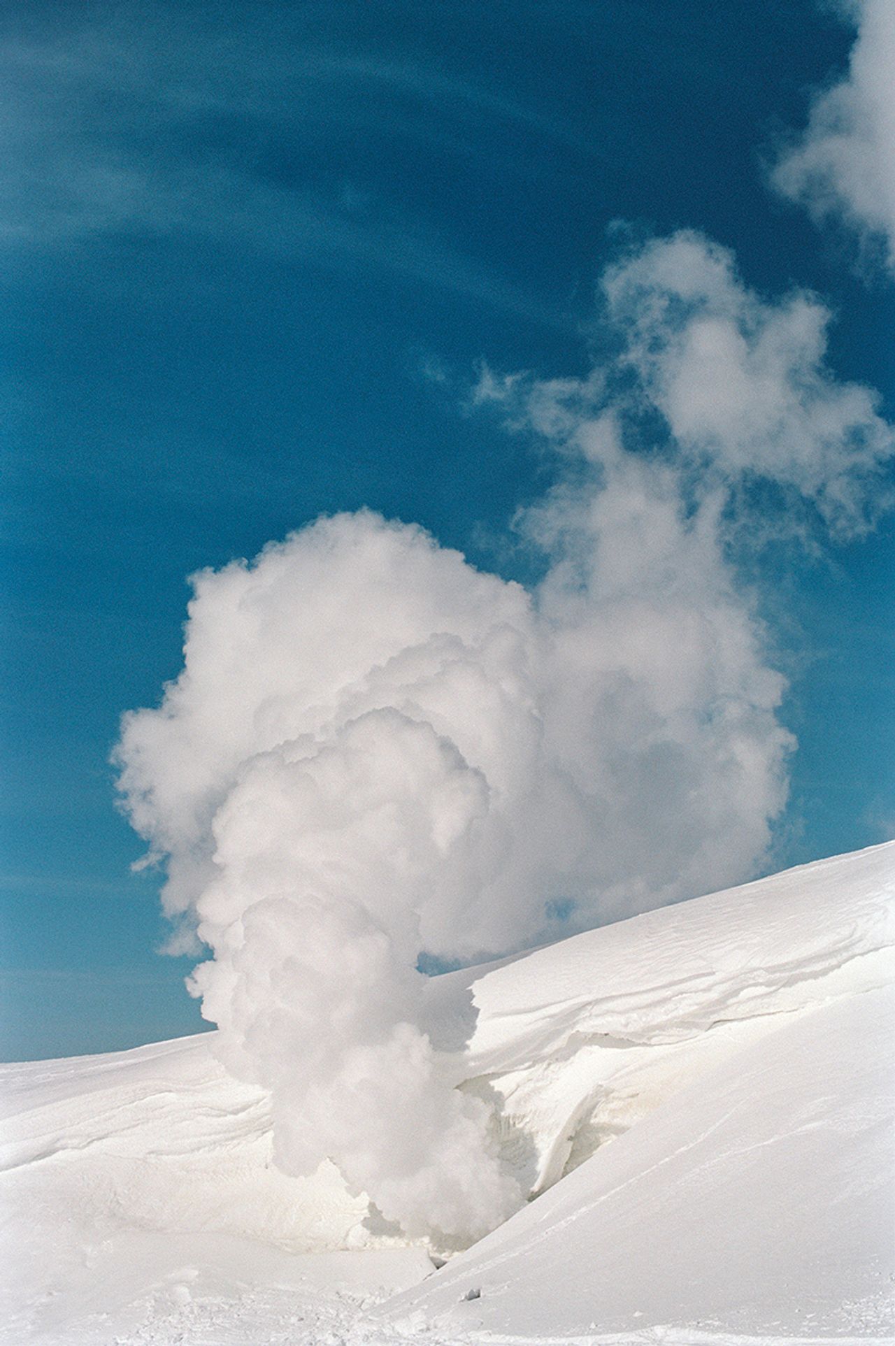 Tout semble prendre une autre forme. Une fleur séchée au détour d’un sentier s’inscrit comme un idéogramme. Tout devient graphique dans cette dérive à laquelle il s’est laissé aller. Niseko, Hakodate, Obihiro, Kushiro, Abashiri, Asahikawa, comme autant de lignes de fuites et de poches temporelles... On glisse avec lui sur les pistes vierges et non balisées de Asahidake, comme dépassé par la magie de ce pays. Ses photo- graphies témoignent de son abandon émerveillé : Hokkaidō est bleu, blanc, doré.